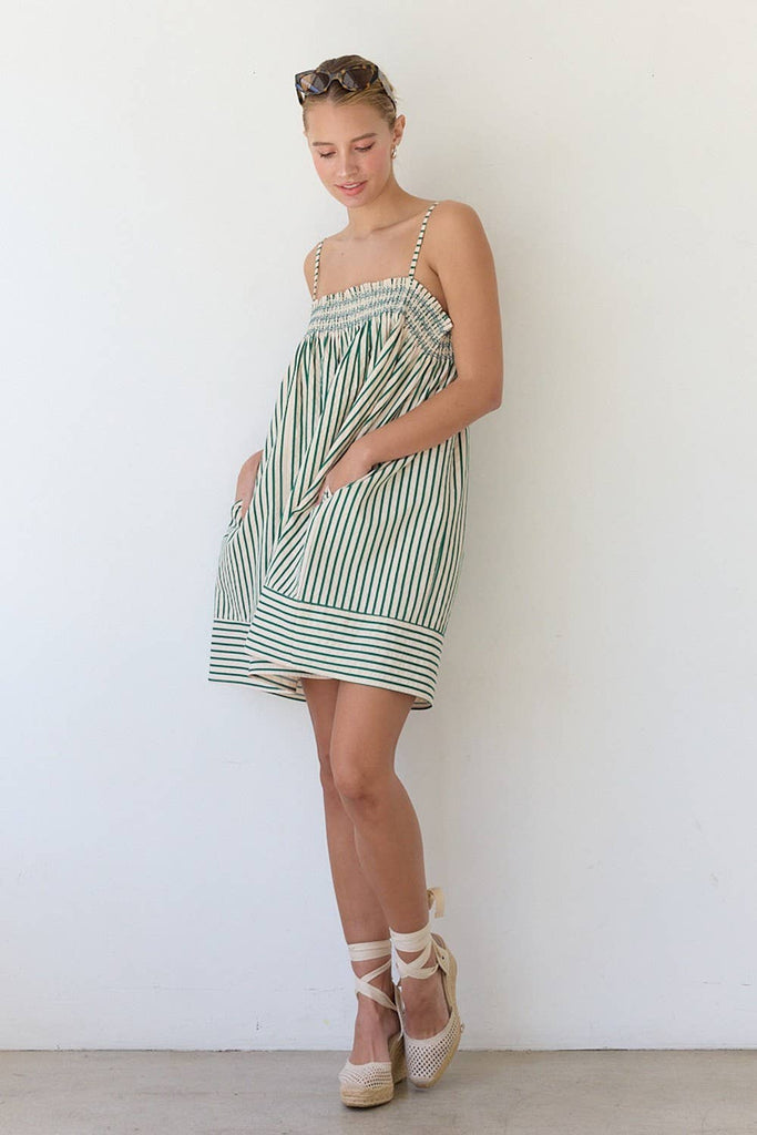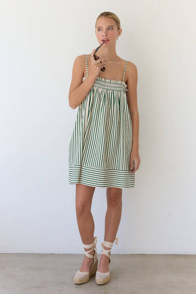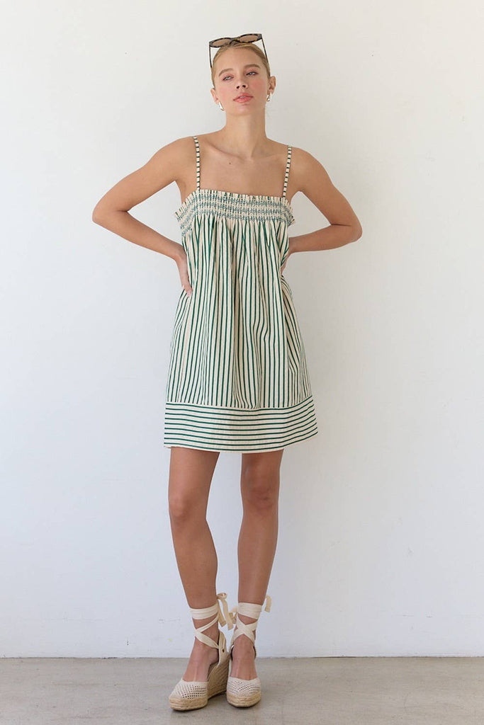 The vertical green stripe pattern elongates the look, while the contrasting horizontal stripe hem adds a playful, thoughtful finish. Lightweight and breathable, the Lynn Dress is perfect for sunny outings, vacations, or casual days when comfort meets style.