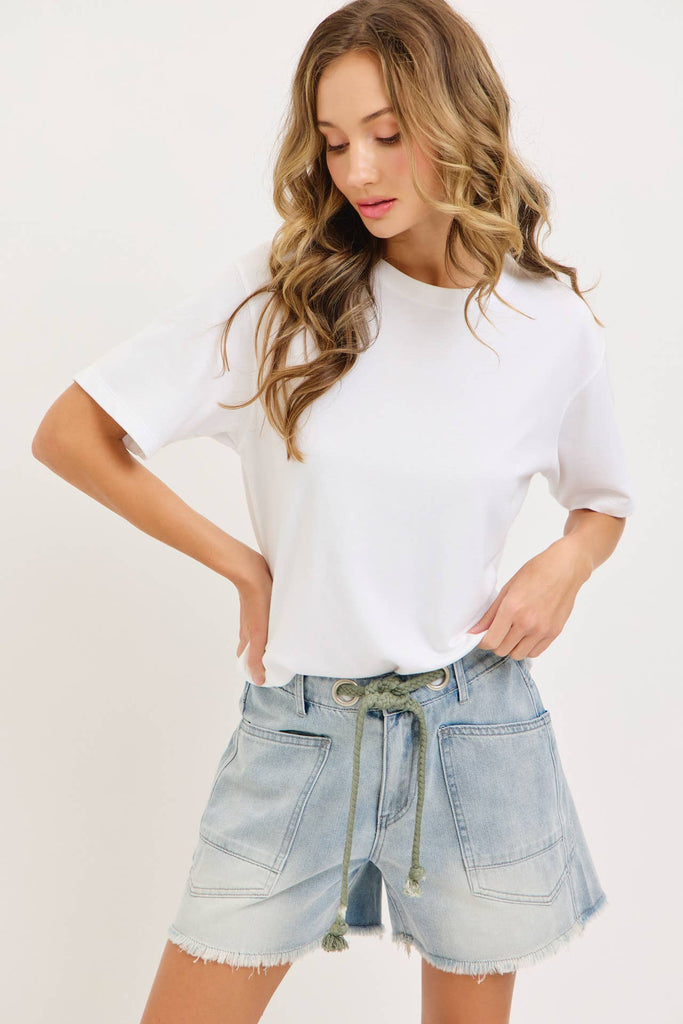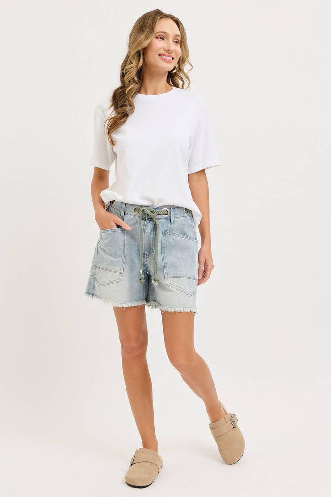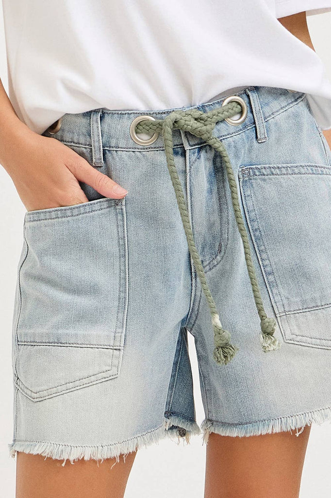 A rope-style drawstring belt threads through metal grommets at the waist, adding a cool, functional detail while allowing for an adjustable, comfortable fit. The slightly relaxed silhouette offers easy movement and a flattering shape—perfect for everyday wear.