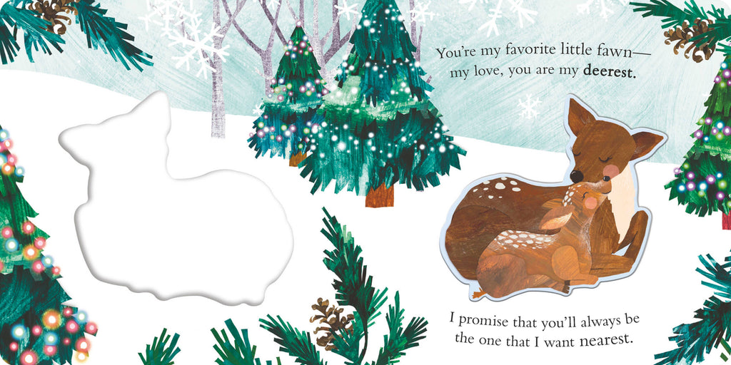 This engaging winter-themed board book takes readers on a journey through the forest to meet adorable animal families, from deer, mice, and birds to foxes, martens, and swans. Each adult animal reassures the younger animal of their love as they snuggle up together. Features a die cut on the front cover as well as a die cut on each page that figures into the storyline.