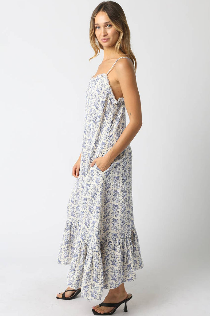 Our Katie Ruffle Maxi Dress features a crinkled lightweight cotton fabric with a floral print and adjustable shoulder straps for a customizable fit. Woven