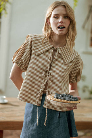 GINGHAM PATTERN SSLV WITH TIE IN FRONT TOP * * Size & Fit * * * * * * * * * * * * * * * * Model is wearing size S Measurements taken from size S Height - 5' 7 1/2" / 175.3CM