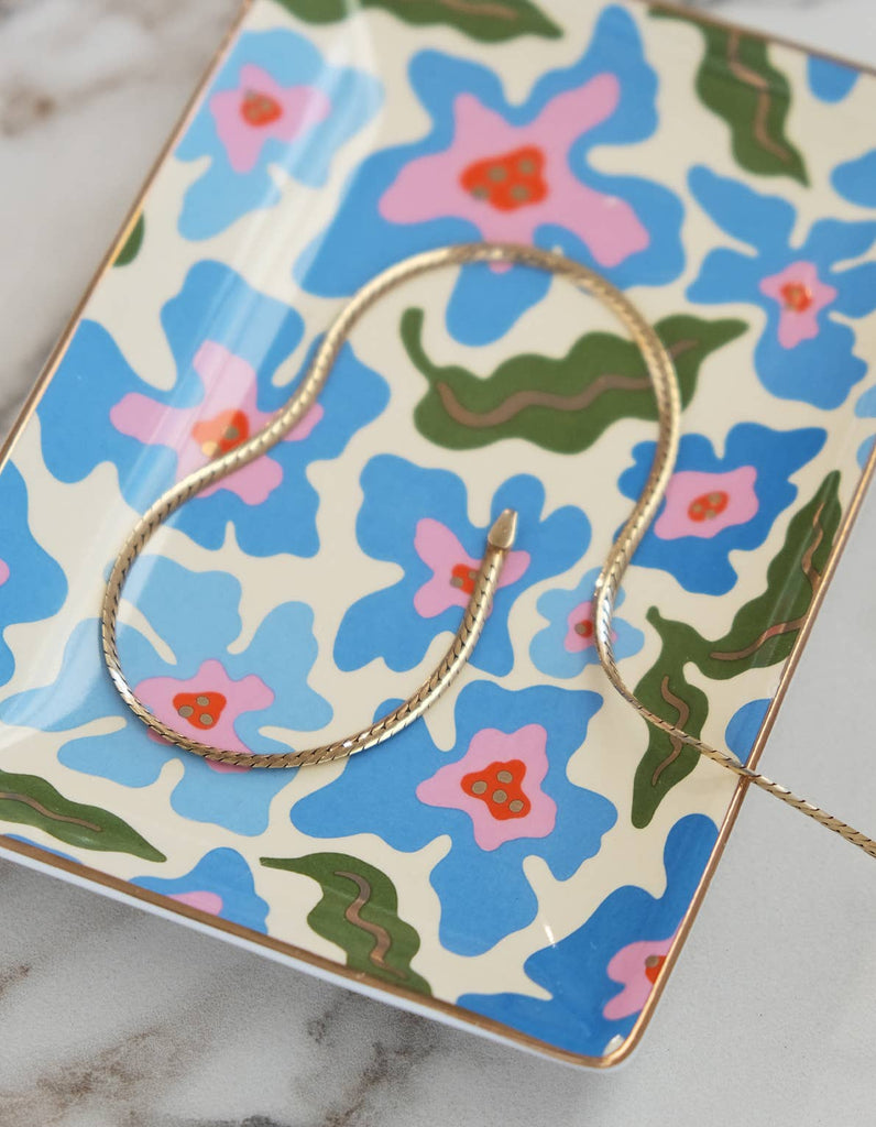 A new addition to our bestselling Trinket Dish Collection, this larger porcelain tray incorporates the Idlewild Co. colorful graphics & 10k detailing you love, now made in a larger catch-all size. Sized just right for keys by the door or your everyday jewelry collection, our Trinket Trays are the perfect finishing touch to elevate your space. • 5.5″ x 3.875″ x .75" • Ceramic with 10k Gold Detailing • Food-Safe | Hand Wash Only Keywords for SEO: Trinket Dish, Dish, Ring Dish, Ceramic, Porcelain, Gold, Idlewild Co., Idlewild, Accessory, Gift, Stocking Stuffer, Jewelry Dish, Jewelry Box, home decor, vintage, display, earring display, displays for retail, gift idea, wedding, earring holder, engagement gift, jewelry displays, necklace display, ring dish, trinket box, easter, easter gift, coffee table, wedding decor, spring, candy, candy dish, spring, floral design, floral, flowers, catchall, catchall tray, mahjong, mahjong accessories