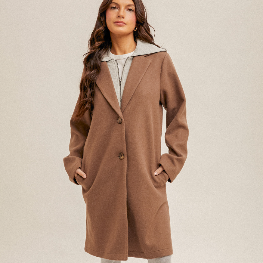 A polished, everyday coat with a cozy twist. This longline mocha layer features clean tailoring, a single-button front, and a soft inner hoodie insert that zips up for extra warmth. The hoodie piece is fully removable, giving you two looks in one—sleek and structured or relaxed and layered. Effortless, versatile, and perfect for cooler days.