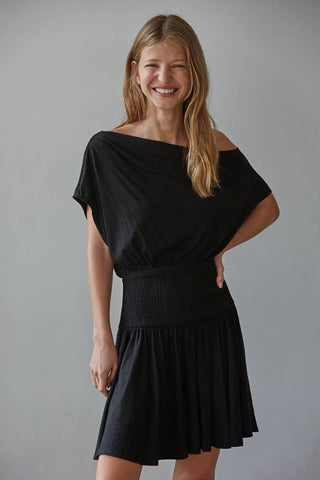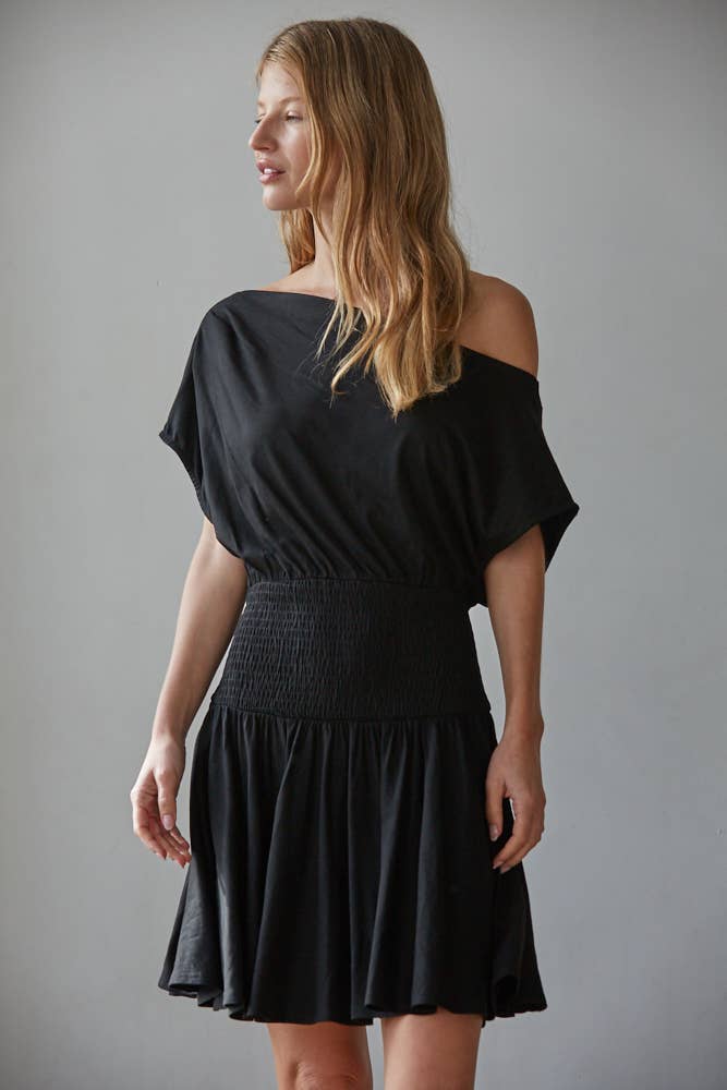 Knit Viscose Spandex Jersey Asymmetrical Neck Sleeveless Smocked Waist Mini Dress (No Lining)