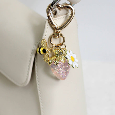 Add a burst of sweetness to your bag with this adorable strawberry charm keychain featuring a gold heart clasp, a cheerful bumblebee, and a delicate daisy flower charm. The glitter resin strawberry pendant catches the light beautifully, creating a whimsical sparkle. Perfect as a purse charm, backpack accessory, or cute gift for her.