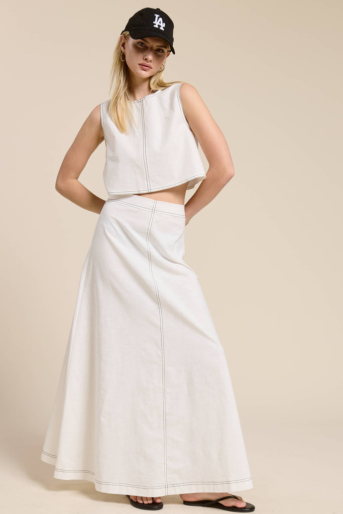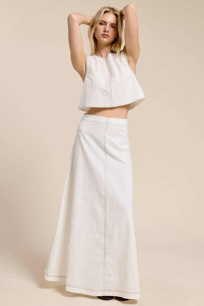 Made from a breathable cotton-linen blend, this matching set features a sleeveless, boxy crop tank paired with a high-waisted maxi skirt that flares into an easy A-line silhouette. The contrast stitch detailing balances minimalism with modern texture - perfect for everyday wear, brunch plans, and vacation styling during the summer.