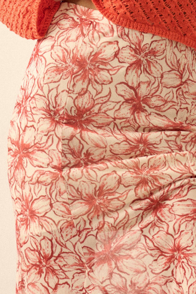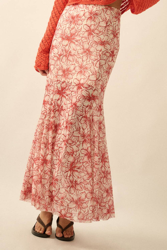 A floral-print mesh maxi skirt with the following features: Paneled design. Mermaid silhouette. Flare bottom with godet pleats. Invisible zipper side closure. Partial thigh-length lining. Ankle length. Fit-and-flare silhouette. * Red 1st cut SOLD OUT. 2nd cut ETA: 2/28/2026. Model Info: Height: 5 ft 9 in | Bust: 32 in | Waist: 24 in | Hips: 36 in | Wearing Size S.