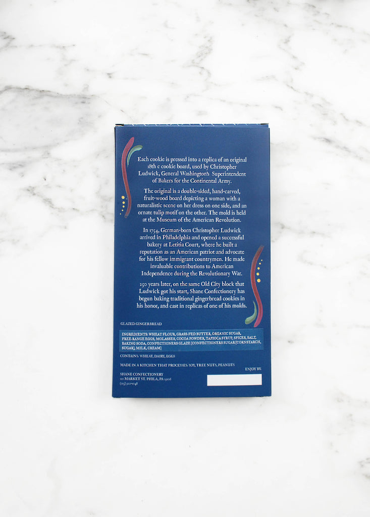 This fragrant gingerbread cookie is hand-pressed into replicas of Revolutionary War baker Christopher Ludwick's original cookie board, held by the Museum of the American Revolution in Old City, Philadelphia. Slightly spicy, molasses-forward with delicate interior, this glazed gingerbread cookie is a favorite among staff & visitors alike.