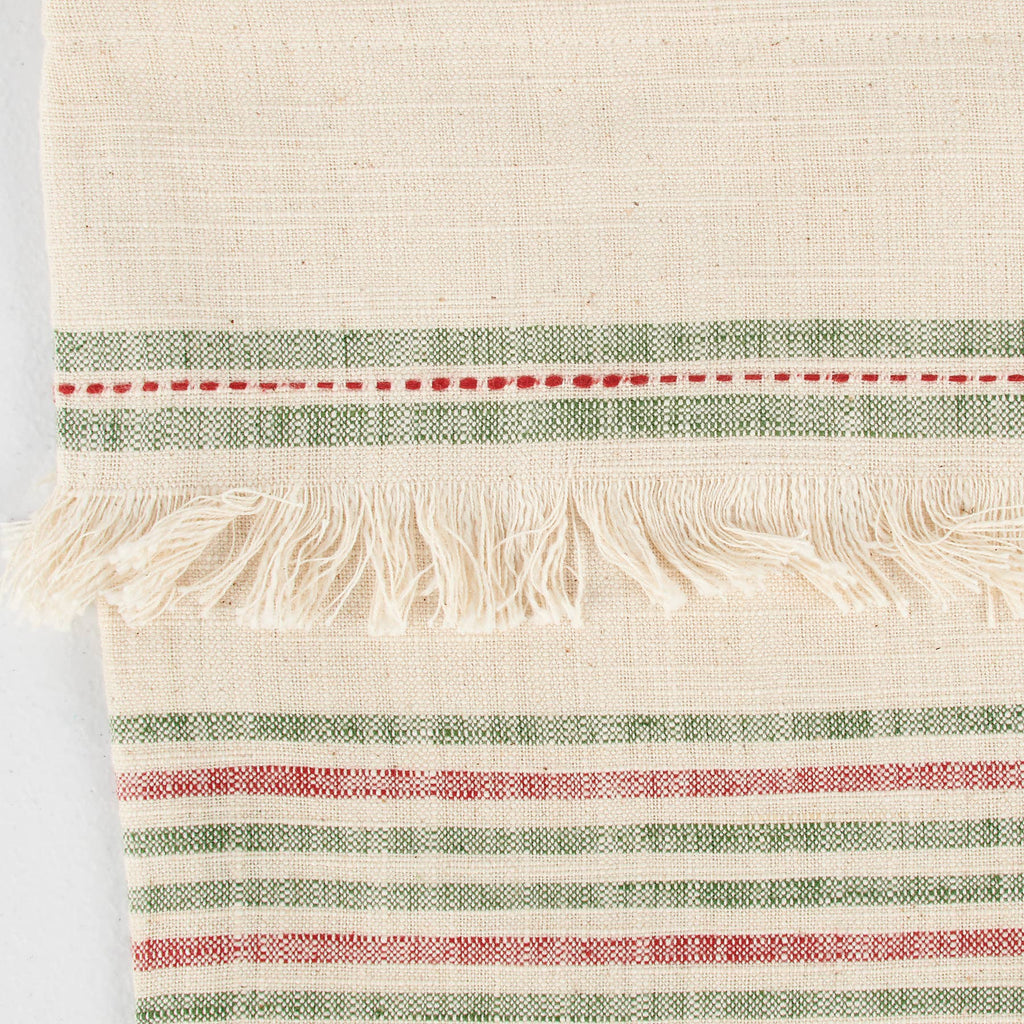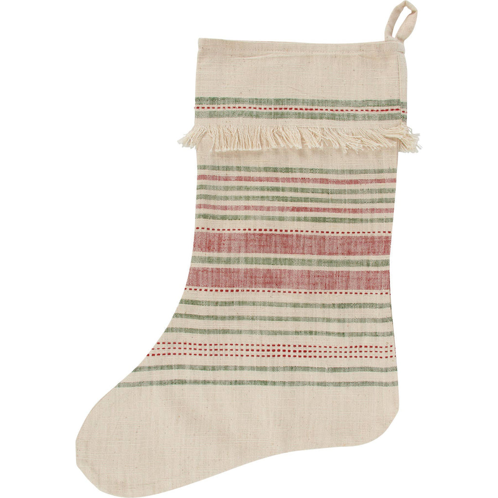 A double-sided cotton stocking from our Christmas Collection displaying a muted red and green stripe design with frayed trim cuff. Our Red & Green Stripes stocking includes a loop for easy hanging. A rustic seasonal home accent.