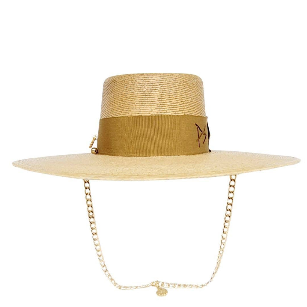 • Band HIS SRAW GAMBLER HAT IS DECORATED WITH WITH GINGER SPICE PETERSHAM RIBBON GOLD PIERCINGS AND PIN. The chain is attachable, so you can wear it as a necklace, or just wear a hat on its own. The embroidered PS initials Petra Savage.
