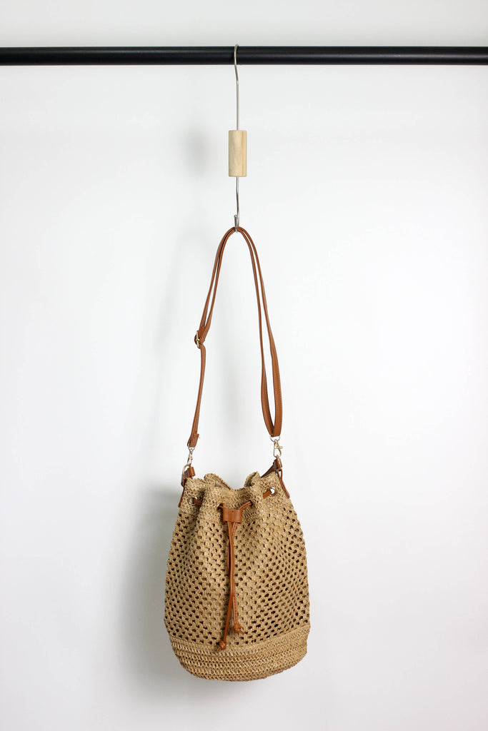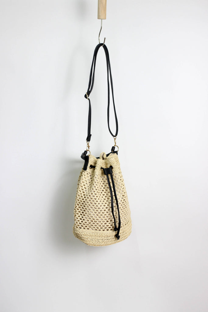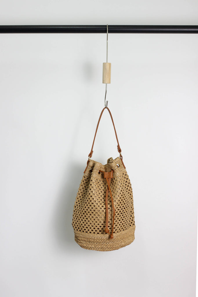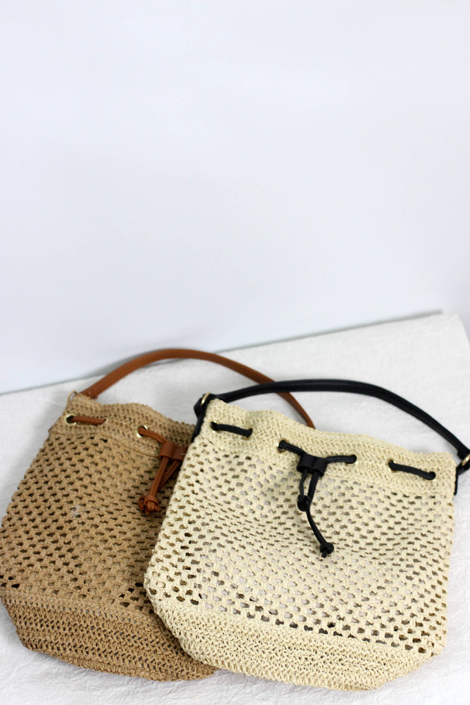 This pair of crochet bucket bags embodies a casual and elegant bohemian aesthetic. Made from natural straw or woven materials, these bags feature a breathable and lightweight design. Each bag is complemented with a leather handle—one in warm brown and the other in classic black—adding a touch of durability and contrast. A secure drawstring closure ensures practicality while maintaining a chic, summery vibe. Perfect for beach outings, casual strolls, or summer events, these bags blend functionality with timeless style.