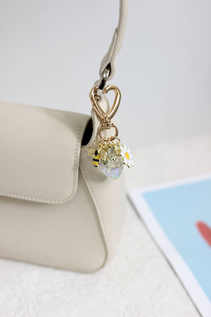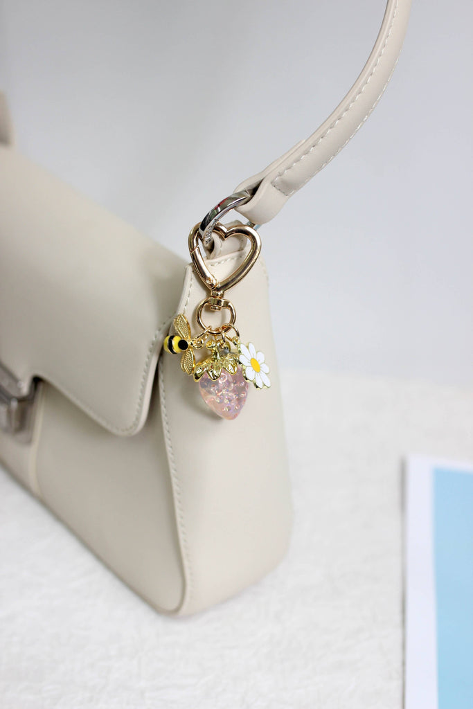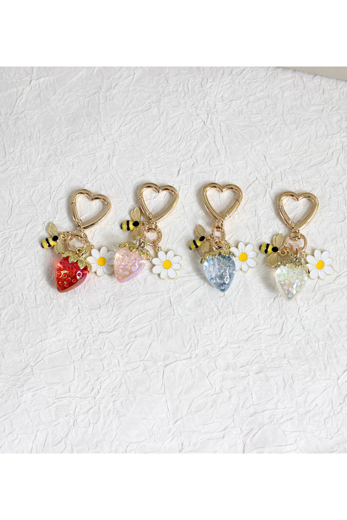 Add a burst of sweetness to your bag with this adorable strawberry charm keychain featuring a gold heart clasp, a cheerful bumblebee, and a delicate daisy flower charm. The glitter resin strawberry pendant catches the light beautifully, creating a whimsical sparkle. Perfect as a purse charm, backpack accessory, or cute gift for her.