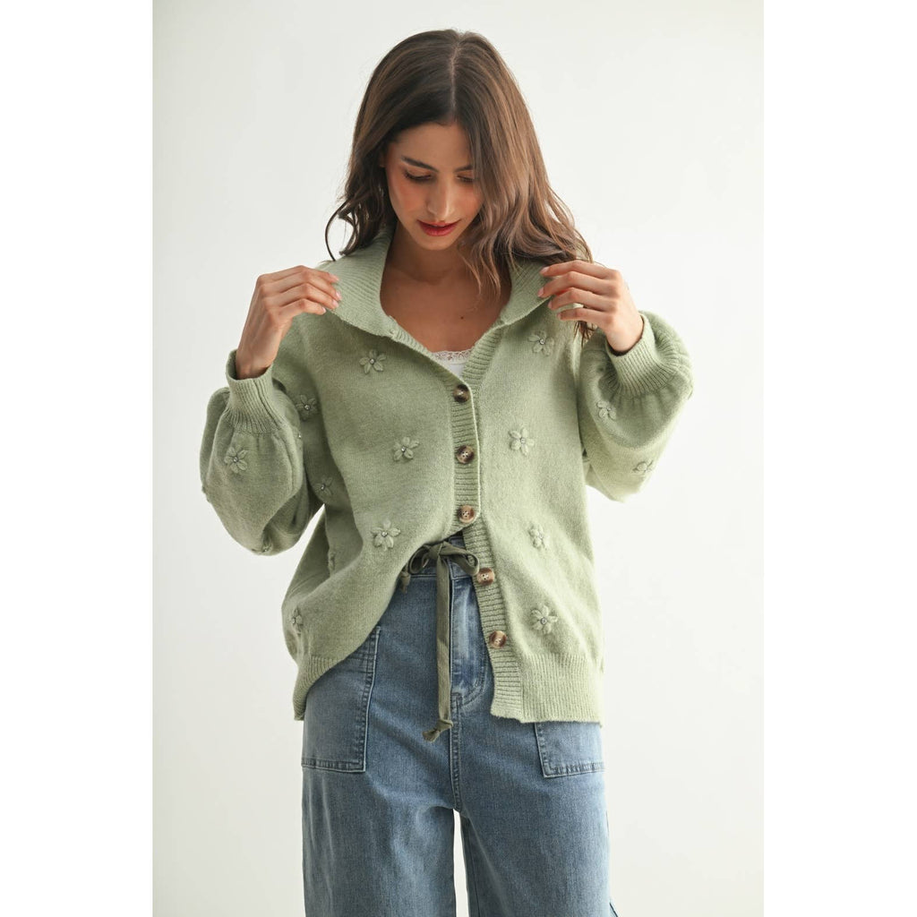 This charming pastel cardigan is designed to bring both style and comfort to your wardrobe. It features delicate floral embellishments, adding a touch of whimsy to your look. The cardigan's cozy fabric promises warmth while maintaining a chic appearance, making it perfect for layering in cooler seasons.