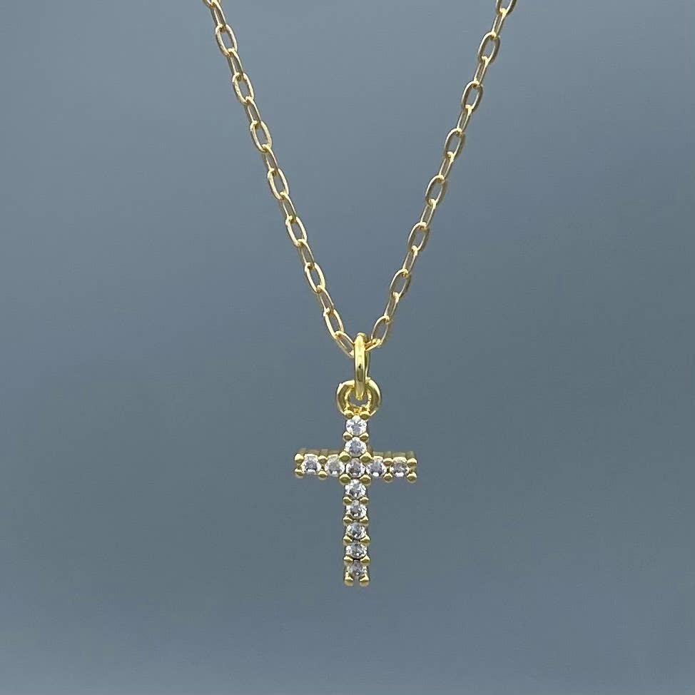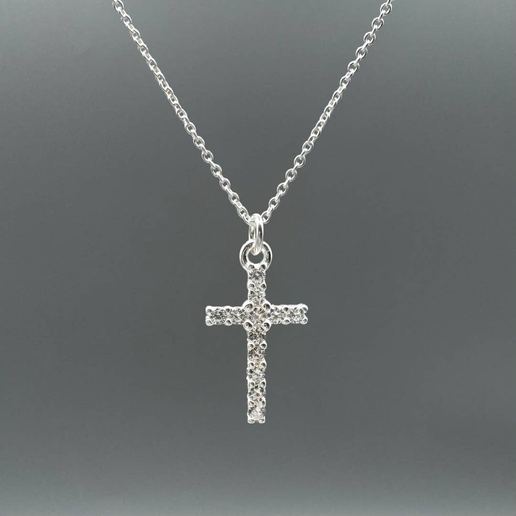 Cubic Zirconia Cross Necklace The perfect prong-set stone cross pendant to wear everyday. .925 Sterling Silver or Gold-fill / Cubic Zirconia 9 x 16mm / 16-18" chain Lobster clasp closure Product is pre-priced at MSRP NG330 NS330