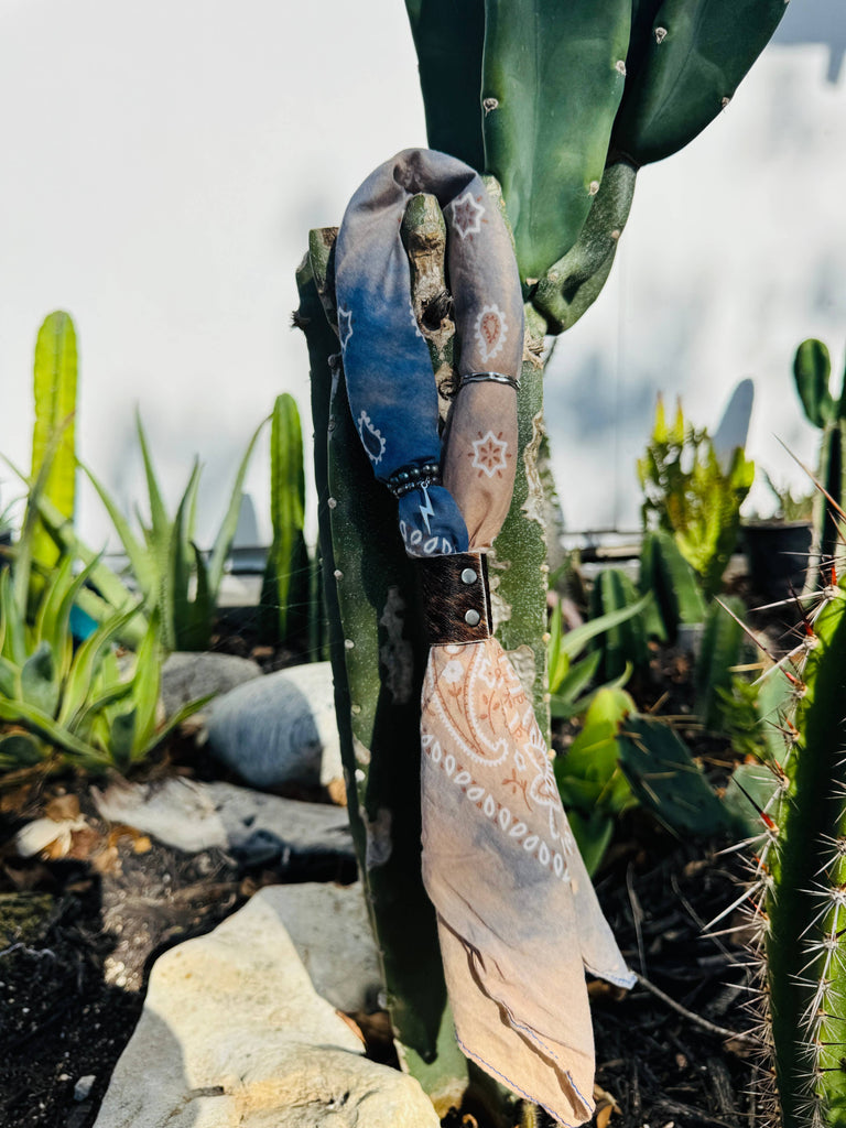 Vintage style hand dyed bandanas with optional genuine cowhide slides. Slides are a metallic spotted hair on hide cowhide with natural suede interior so as not to slip. Bandanas are 100% cotton & measure approximately 22x22 inches. They do not say “made in china”. If you're planning on branding the slides I can switch them out for regular cowhide as the metallic does not brand well. Colors will vary due to our vintage coloring dye process.