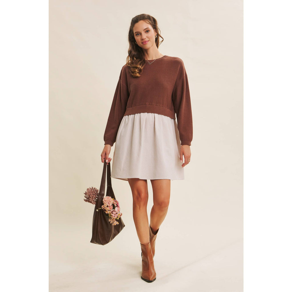 * Style No.: E2335SW A cozy-meets-playful look, this twofer dress combines the comfort of a sweater with the charm of a mini dress silhouette. The soft knit top features a classic round neckline and long sleeves, while the contrast striped skirt adds gentle volume and movement. What truly sets this piece apart is the open-back detail finished with two oversized self-tie ribbons—creating a statement from every angle. Effortless to wear yet thoughtfully designed, it’s a transitional piece that makes styling simple. Just pair with boots and you're ready for a crisp-weather stroll or an easy coffee date. The subtle A-line skirt is finished with functional side pockets for added ease. Designed to feel both special and wearable, this piece captures the relaxed elegance IN FEBRUARY is known for—soft, sweet, and quietly refined. Features - Long-sleeves - Sweater top - Stripe skirt - Twofer mini - Back ribbon tie - Side pockets - Round neck Size + Fit Model is 5'9.5" and wearing a size S.