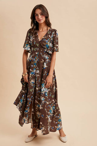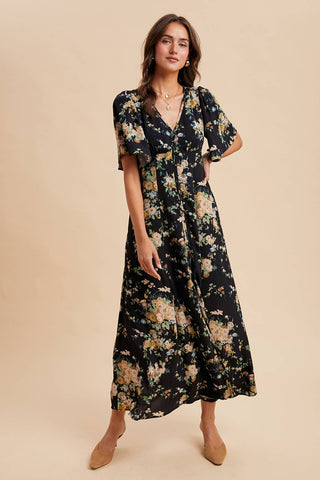 EASY TO WEAR FLORAL FLUTTER SLEEVE MAXI FEATURES: - WOVEN FLORAL FABRICATION - V NECKLINE - FUNCTIONAL BUTTON DOWN DESIGN - FLUTTER SLEEVES - SMOCKED WAISTBAND AT BACK - BELTED SELF WAIST TIE - SIDE POCKETS - HIDDEN SIDE ZIPPER - FULL LINING.