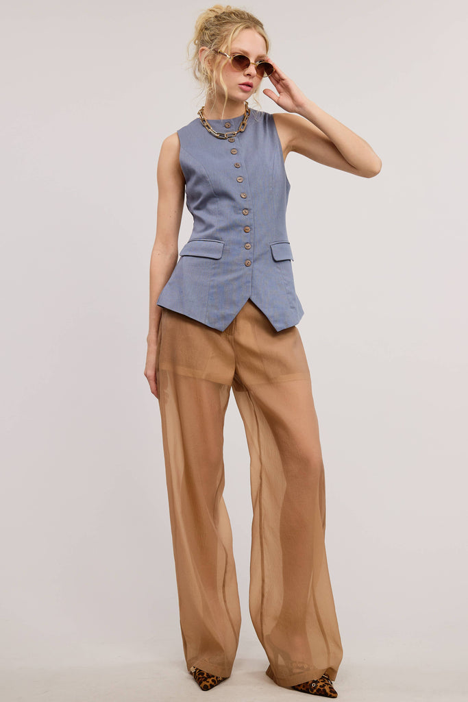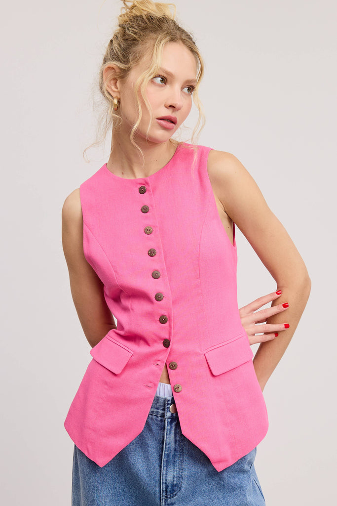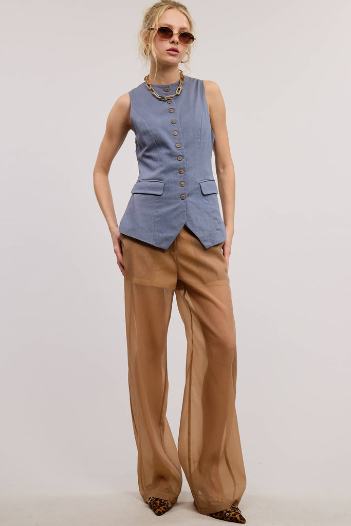 This sleeveless vest top features a structured, tailored fit with a round neckline, mini front button closures, and side pocket accents. Designed with an adjustable back belt for a personalized fit, it features a split hem and an elongated silhouette for a sleek longline silhouette.