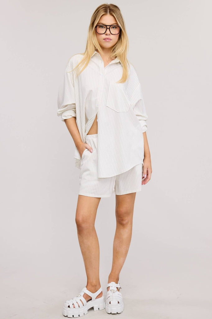 A modern pinstripe matching set perfect for resort getaways, city strolls, or transitional layering through the seasons. • Lightweight pinstripe woven fabric with a soft, structured drape • Oversized button-down shirt with a classic collar...