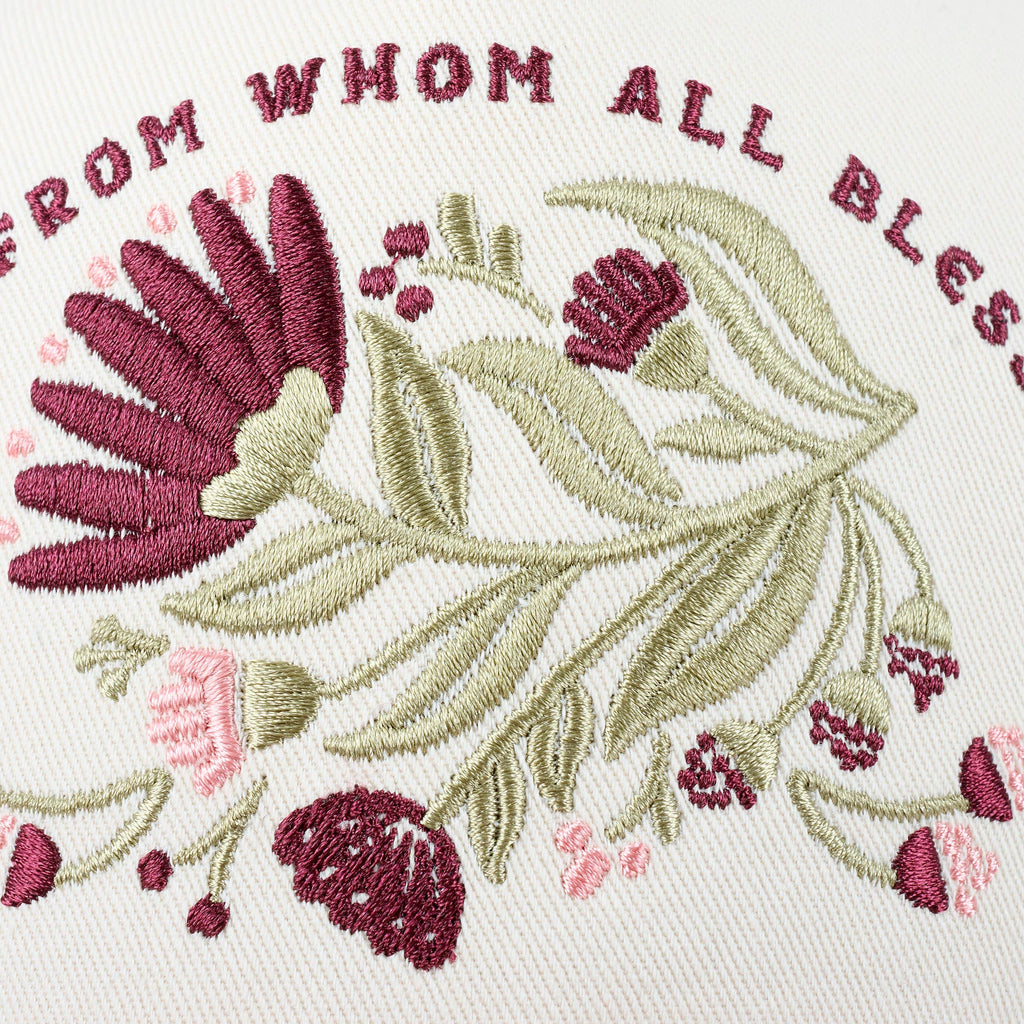 A cotton trucker hat from our Faith Collection displaying beautiful red flowers replicated from original hand illustrated art with a faith inspired sentiment that reads "Praise God From Whom All Blessings Flow." Floral design and faith sentiment is embroidered for added texture with a coordinating pink color cording accent. Our Praise God trucker hat is one size fits most with an adjustable snap closure to create the perfect fit and full mesh back for comfort and breathability in hot weather. Hand wash only. A faith-themed accessory perfect for gifting and everyday self expression.