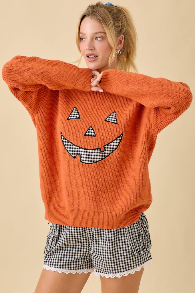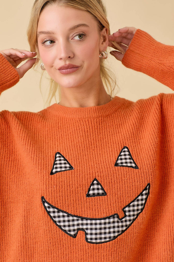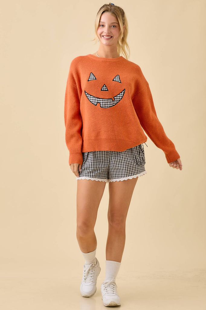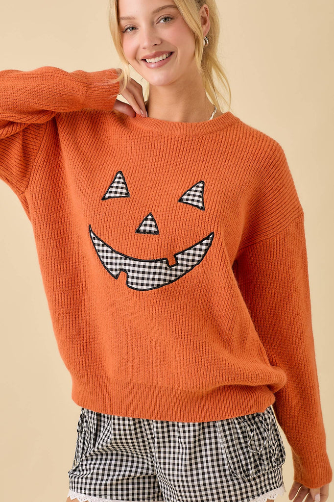 Pumpkin Face Patchwork Sweater Knit Top