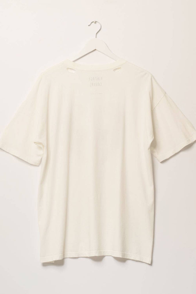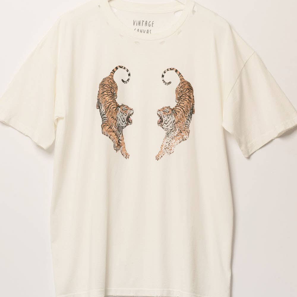 A distressed, garment washed graphic t-shirt with the following features: Vintage-style roaring tigers graphic print. Round neckline. Short sleeves. Dropped shoulders. Torn and distressed detailing at neckline. Oversized fit.