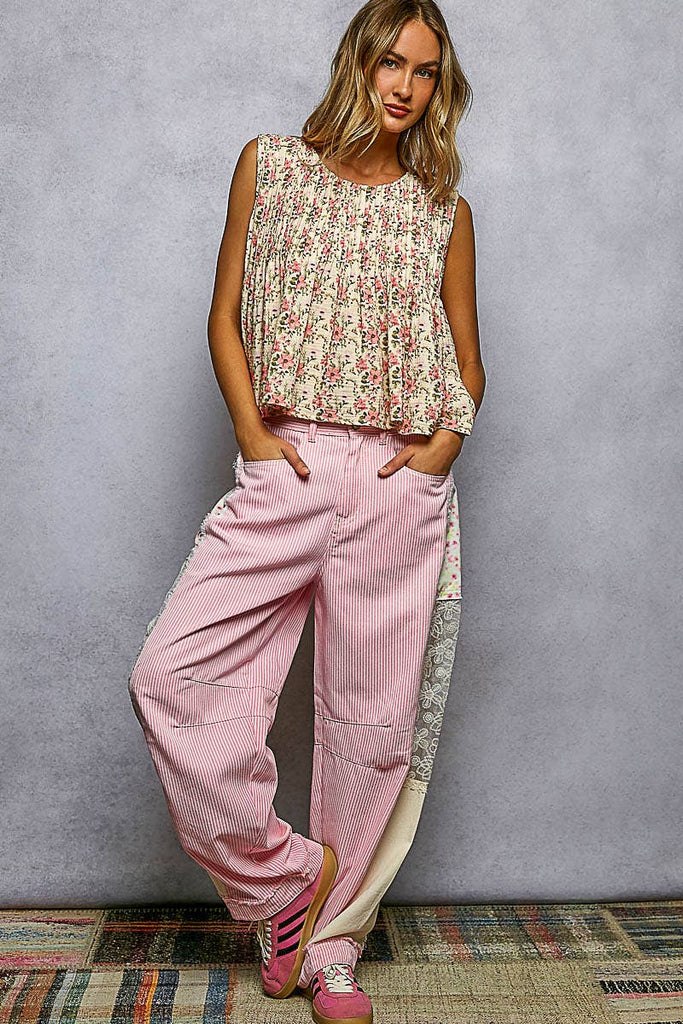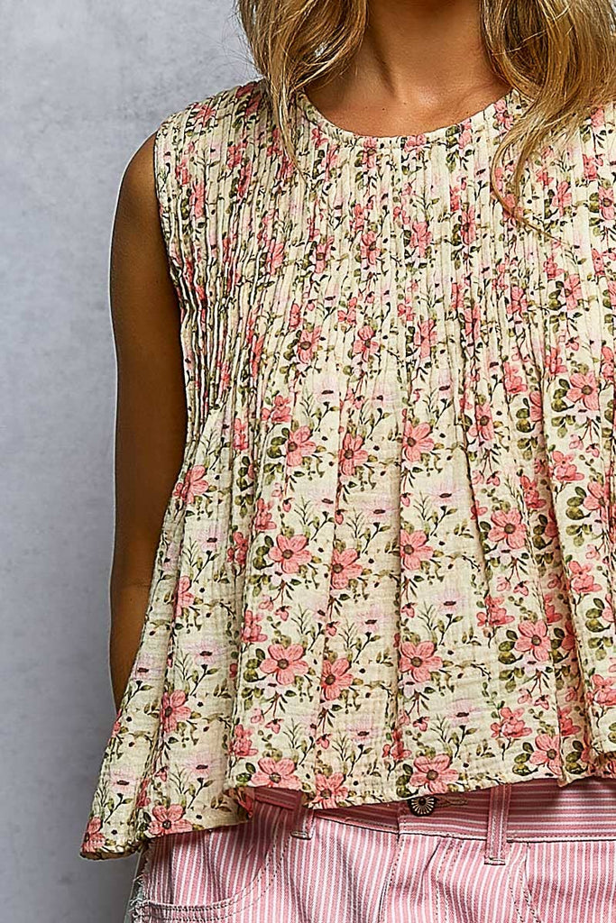 A round-neck sleeveless top with a regular A-body fit, crafted in double gauze woven fabric. Features pintuck detailing, a back button closure, and a delicate floral pattern for a feminine, lightweight look perfect for everyday styling. Specs/Dimensions: - Please call or message our team for more info.
