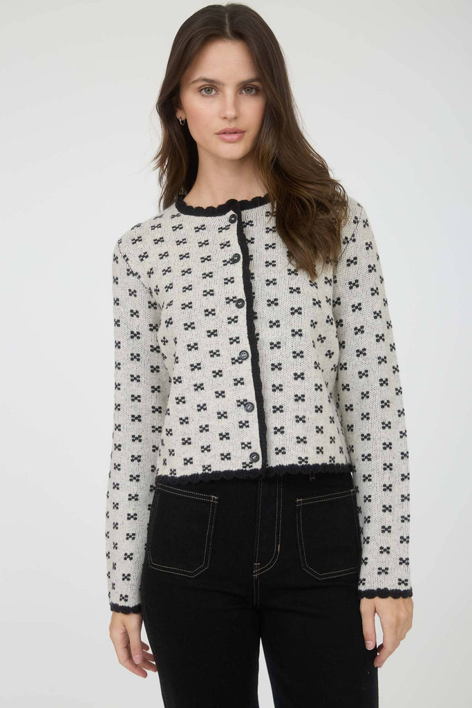 CR2713 2 SMALL 2 MEDIUM 2 LARGE ROUND NECKLINE BUTTON DOWN FUNCTIONAL BUTTONS LONG SLEEVES SCALLOP TRIM CONTRAST TRIM DETAIL X PATTERN NOT LINED KNIT CARDIGAN SWEATER 57%POLYESTER 34%ACRYLIC 9%NYLON