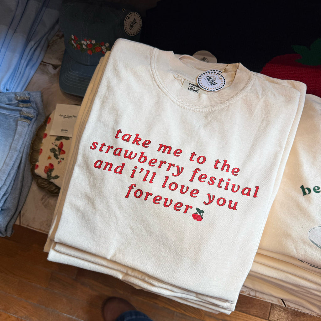 "Take me to the Strawberry Festival and I'll love you forever!" Tee is the perfect look this strawberry season! Made on a Comfort Colors unisex tee in ivory