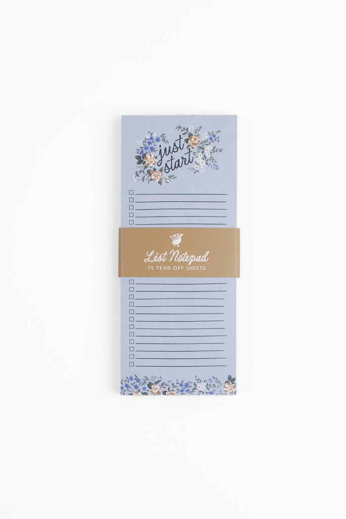 Stay organized with the Blossom List Notepad, your daily companion for tasks both big and small. With hand-drawn blossoms and a gentle nudge to ‘just start,’ this tear-off pad brings productivity and thoughtful intentionality to your to-do list. Whether you're planning a grocery run, tracking your goals, or jotting down tasks, each page is ready to support your day. Slim and lovely, it fits perfectly on your desk, bedside, or kitchen counter. Features: * 75 tear-off pages * 3.5” x 8.5” * Printed in full color on uncoated paper * Chipboard backer * Designed in the USA and made in China