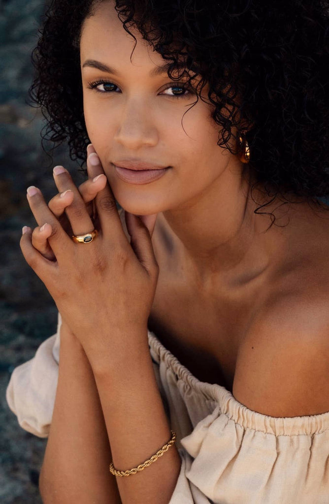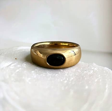 Everyday luxe is what crosses the mind with our Capistrano Ring... a lightly domed silhouette with a faceted black glass center.