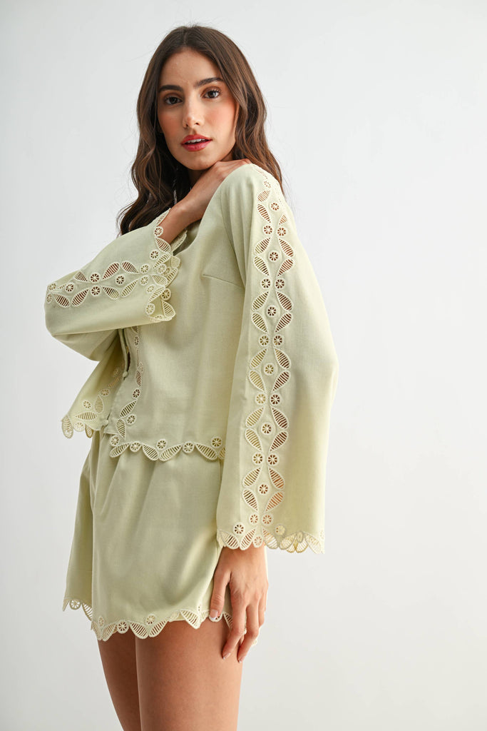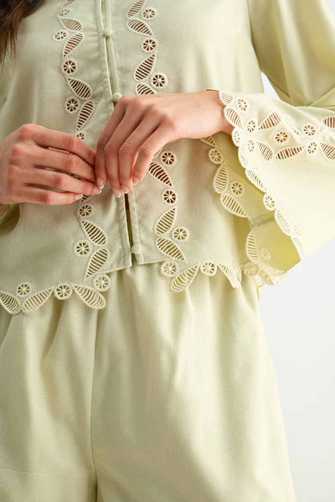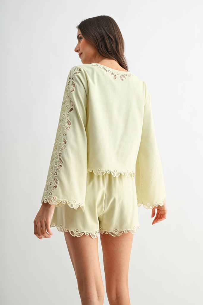 Experience the perfect blend of sophistication and comfort with this pastel two-piece ensemble, tailored for those who appreciate a polished, high-end look. Designed for versatility, this coordinated set features an elegant, button-down top with graceful, wide sleeves and matching shorts. The subtle pastel hue ensures an understated yet fresh appearance suitable for professional environments or exclusive leisure settings. SELF: 70% VISCOSE, 30% LINEN LINING: 100% RAYON Model is wearing a size S Model : 5'9" - B 32" - W 24" - H 36.5"