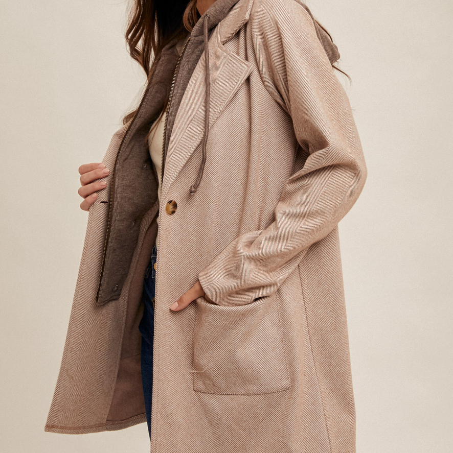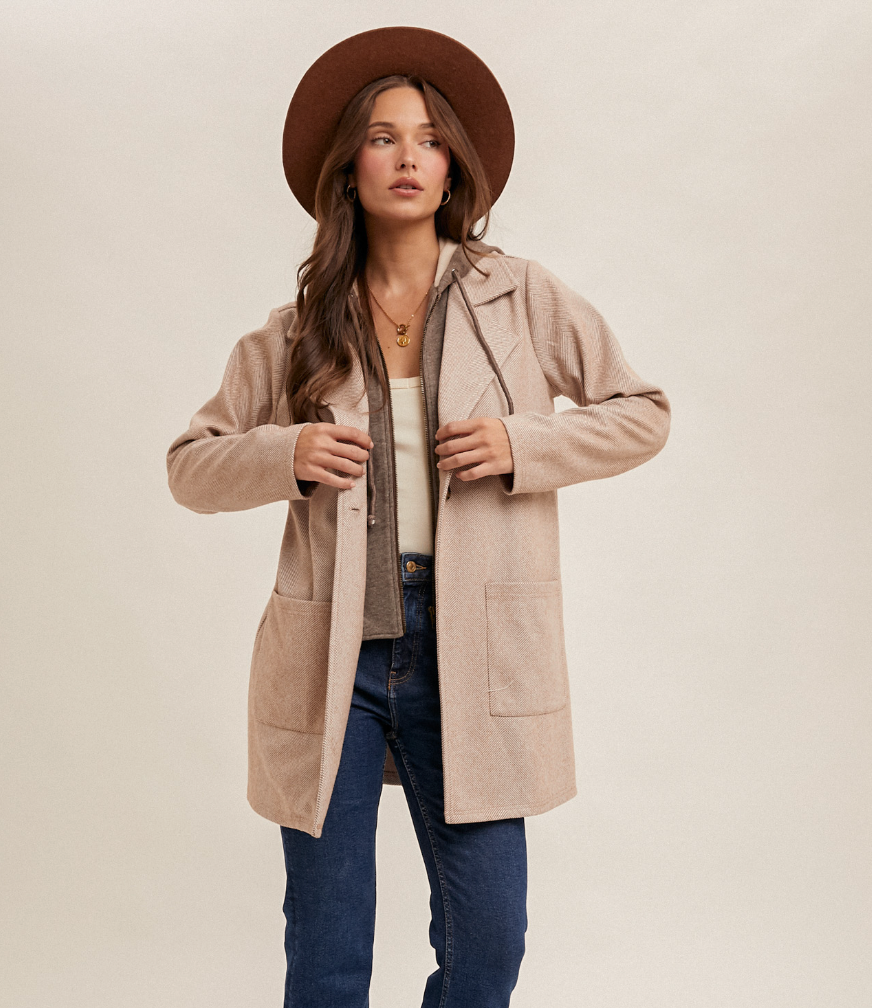 Faux-hoodie coat with a classic herringbone design, available in mocha or taupe. Features a warm, structured outer layer with a removable soft sweater-hood insert, giving you two looks in one—layered and cozy or clean and tailored. Perfect for effortless, versatile styling all season long.