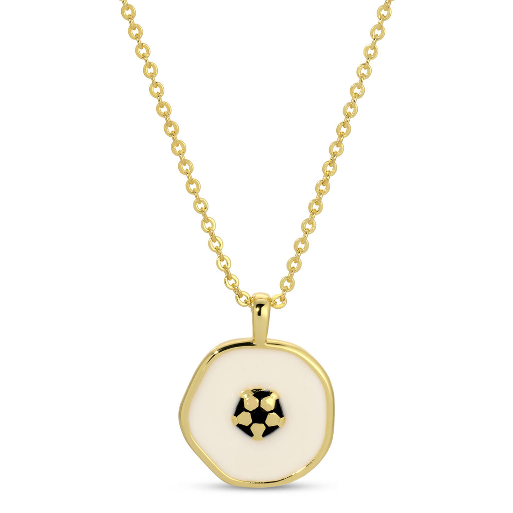 Goooal! A shiny enamel pendant with a cute little soccer ball - perfect for showing off your love for the game! -.75" Pendant -18" Necklace -Enamel -Plated -Brass -Quick-Display Folded Hang Tag