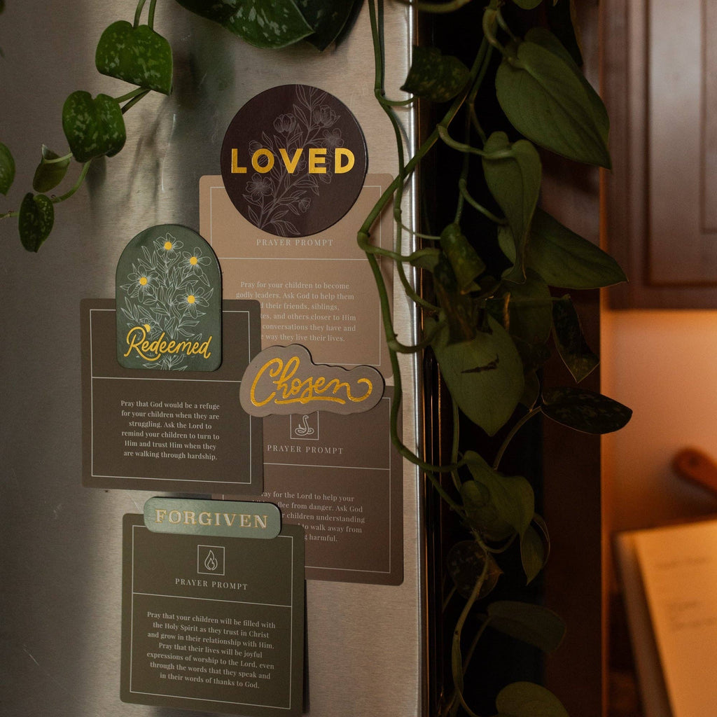 For he chose us in him, before the foundation of the world, to be holy and blameless in love before him. Ephesians 1:4 Want to be reminded of your identity in Christ often? Do you love using inspirational magnets to brighten up your refrigerator or magnetic board? This beautiful Identity Magnet Set includes four magnets that will encourage you every time you see them. Each magnet represents a different theme of your identity in Christ: * Loved * Redeemed * Forgiven * Chosen Here’s why you’ll love these magnets: * Encouraging: you’ll be reminded of your identity in Christ just by hanging something on your refrigerator. * Beautiful: With custom designs and gold foil accents, you’ll smile every time you see them. * Durable: Vinyl laminate protects against water and sunlight so these magnets will last you for years to come. Get this Identity Magnet Set, put these magnets in a place you’ll see every day, and be continually reminded of your identity in Christ! Details: * Words/phrases insc