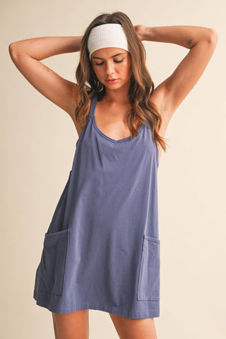 SLEEVELES KNIT ROMPER ATTACHED DRESS WITH FRONT POCKETS 95% COTTON 5% SPAN
