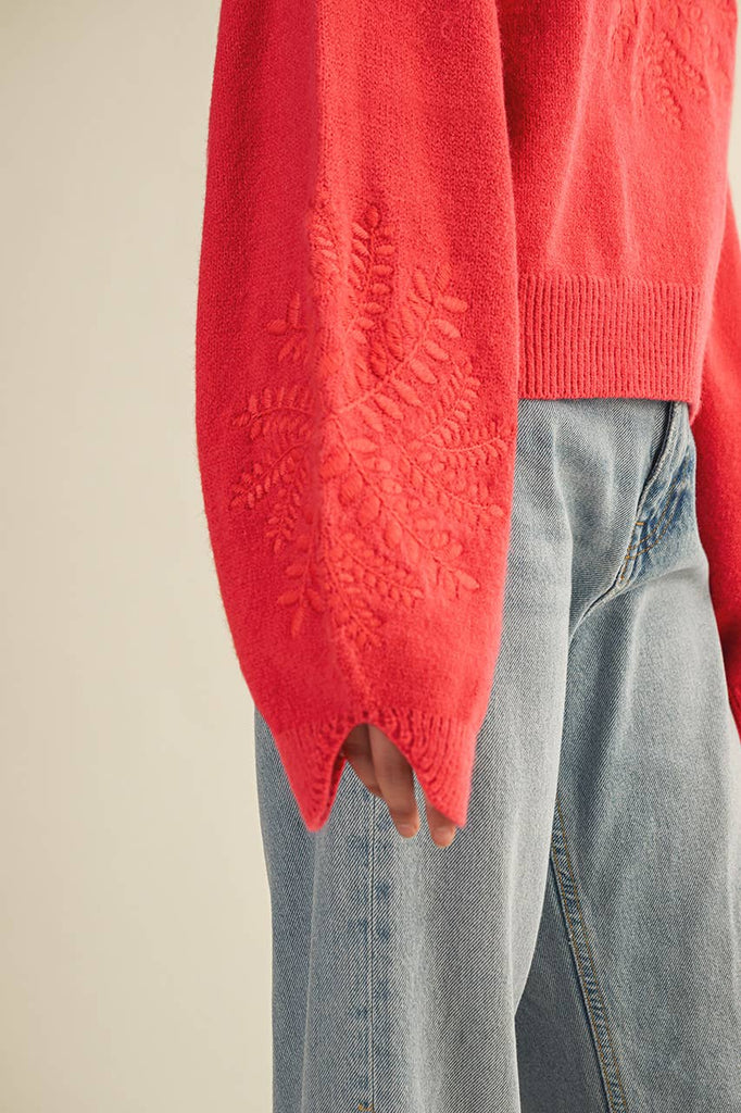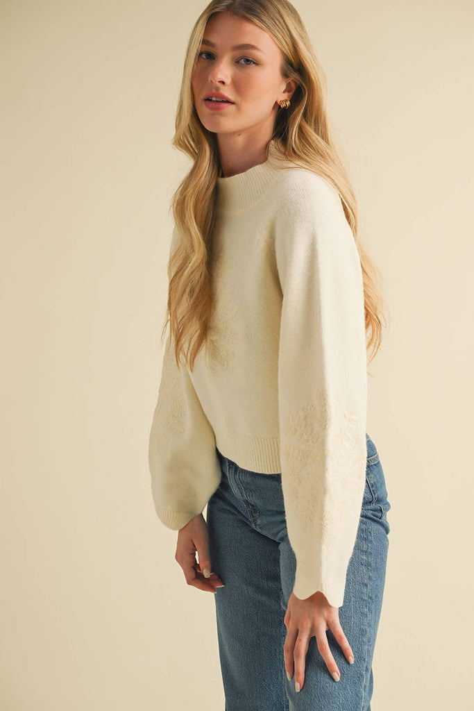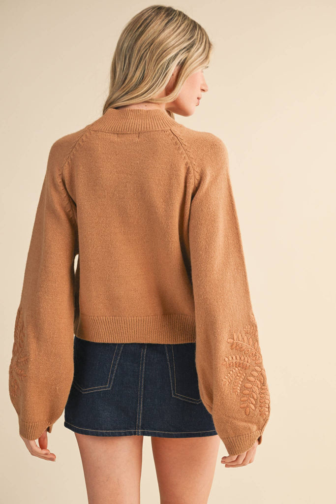 This embroidered mock neck sweater is an essential for those breezy Fall days! Soft sweater knit shapes a mock neckline, raglan seam long balloon sleeves, and a relaxed bodice. Floral embroidery on the front bodice...