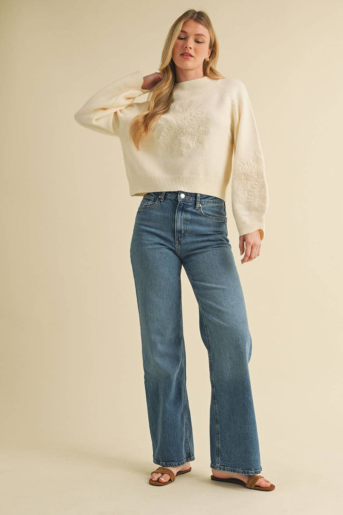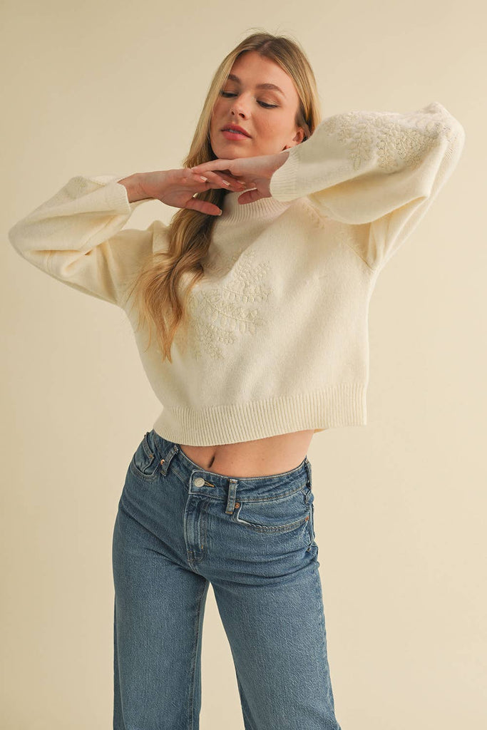 This embroidered mock neck sweater is an essential for those breezy Fall days! Soft sweater knit shapes a mock neckline, raglan seam long balloon sleeves, and a relaxed bodice. Floral embroidery on the front bodice and sleeves adds darling accents to this sweater. Pair with any of your favorite bottoms for a look you will love! + Mock neck balloon sleeve embroidered sweater + Ribbed mock neck + Raglan seam + Long balloon sleeves with ribbed cuffs + Floral embroidery on front bodice and sleeves + Relaxed bodice + Ribbed hem + Model is 5' 9” 30-23-34 and wears a S