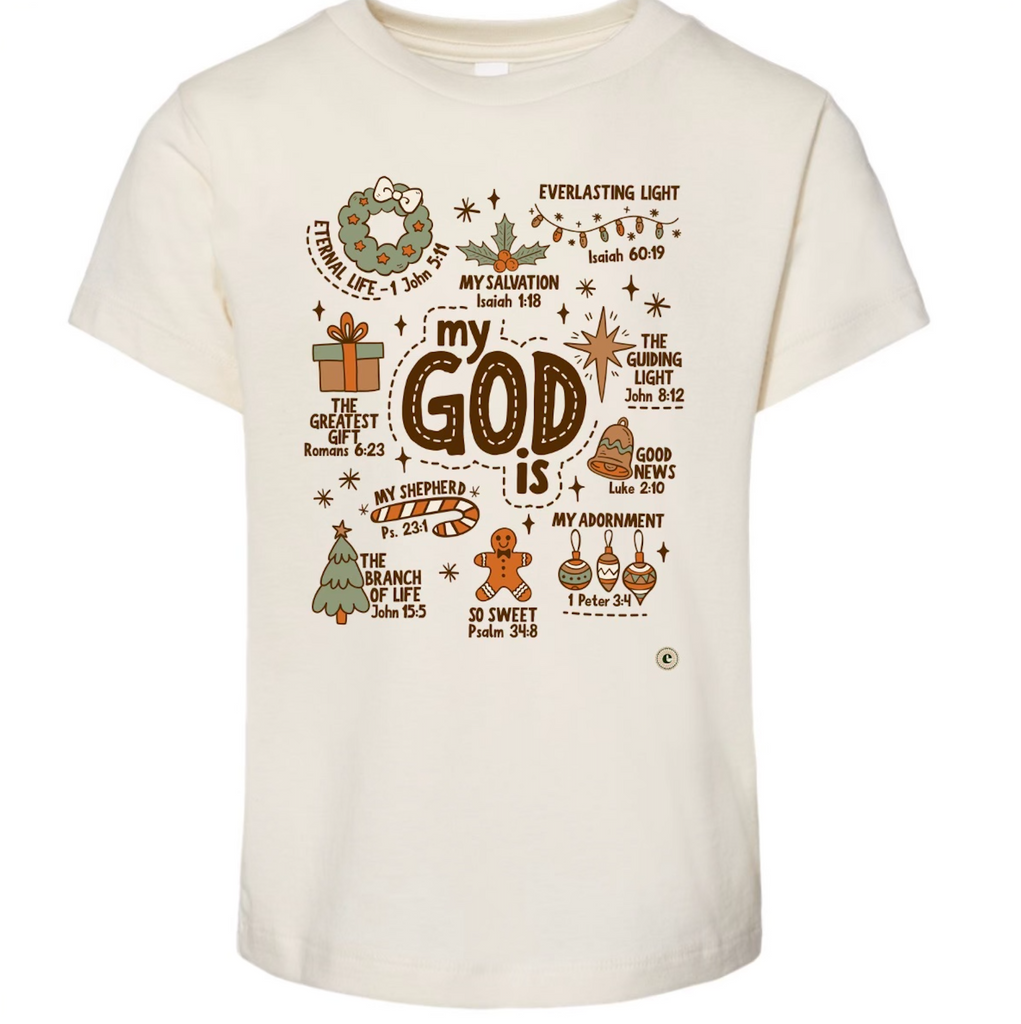 Celebrate the true meaning of Christmas with this beautifully illustrated My God Is tee. Designed with warm, festive artwork and meaningful Scripture references, this shirt points back to who God is—our Light, Salvation, Shepherd, and Greatest Gift.