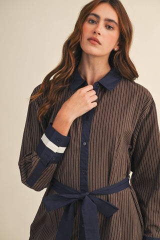 + Striped button down belted mini dress