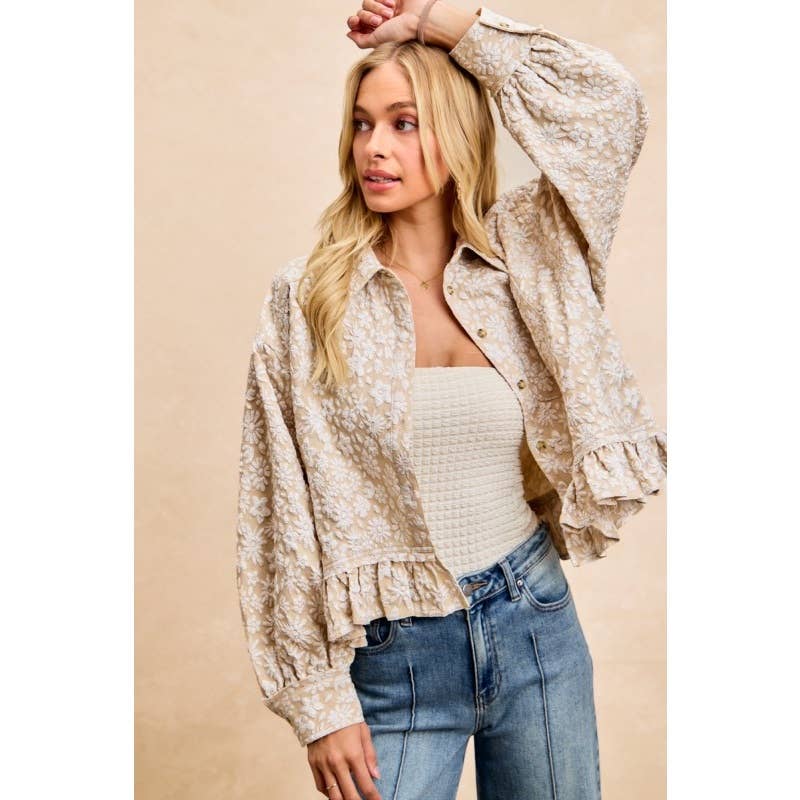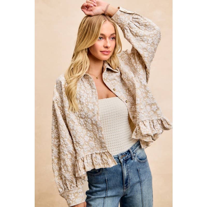 Soft, romantic, and effortlessly layered, the Daisy Ruffle Jacket is the perfect lightweight statement piece for transitional seasons. Featuring an allover daisy-inspired texture, this jacket blends feminine charm with an easy, everyday silhouette. The cropped length and subtle peplum-style ruffle hem add movement and shape, while the ruffled cuffs bring a touch of playful detail.